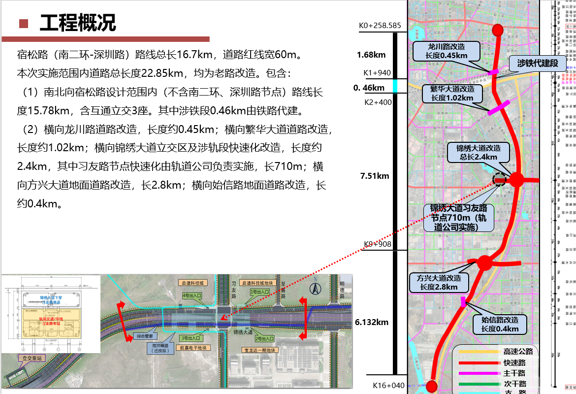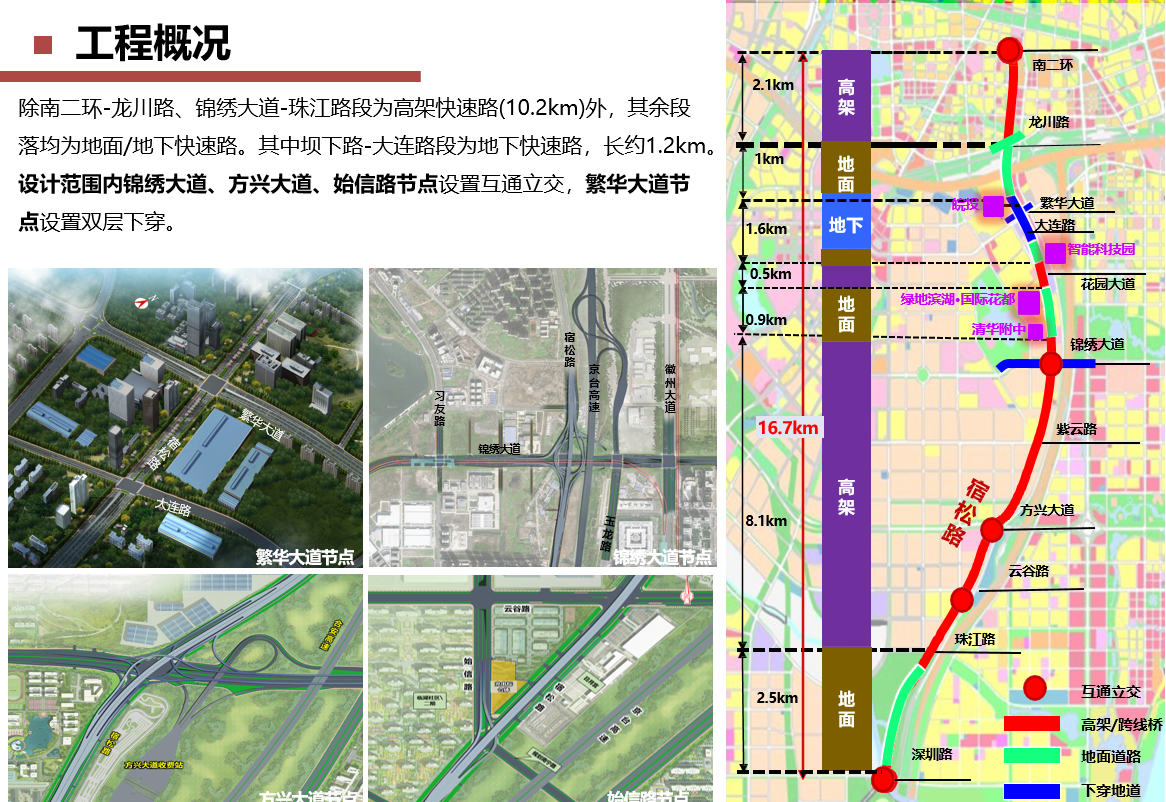 宿松路快速化刷新工程为市大建设妄想重点项目,,,,,由市城乡建设局委托大发500公司举行全历程代建。。。。。该项目北起南二环,,,,,南至深圳路,,,,,长约16.7km,妄想为都会快速路,,,,,妄想红线宽度60m。。。。。工程建设内容主要包括:蹊径、桥梁、隧道、排水、泵站、管廊、绿化、照明、交通、电力土建、给水、中水及漂亮大道习友路节点刷新等,,,,,工程估算总投资约85亿元。。。。。该项目建成后对构建都会快速路网系统、缓解都会南向交通拥堵、推动都会社会经济生长、提高都会综合竞争力均具有主要意义。。。。。
